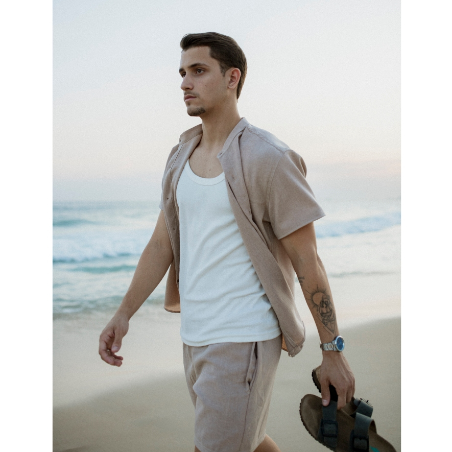 Conjunto em linho leve e confortável para o dia a dia. Camisa de manga curta com bolsos frontais e short com forro 988