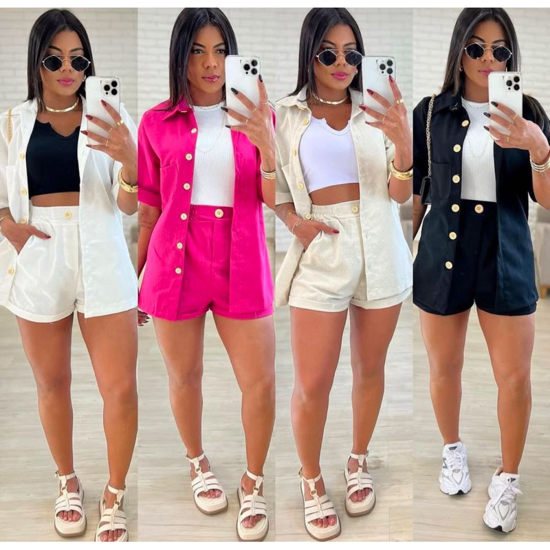 Conjunto Feminino Camisa manga curta e Shorts Linho casual social Moda tendencia com botão dia a dia