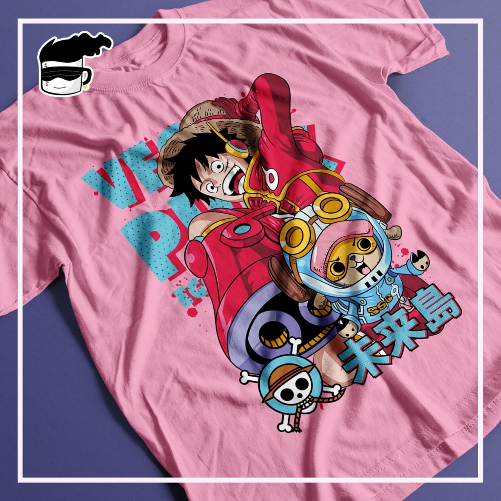 Camiseta One Piece Luffy e Choppe EggHead VegaPunk Unissex Camisa Anime Rosa