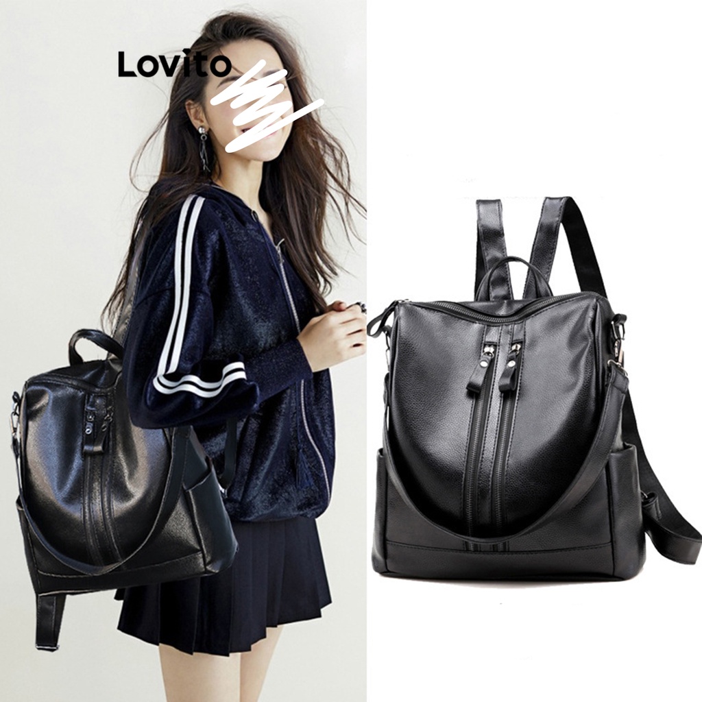 Lovito Mochila Elegante Com Zíper Liso Para Mulheres LFA08054 (Preto)