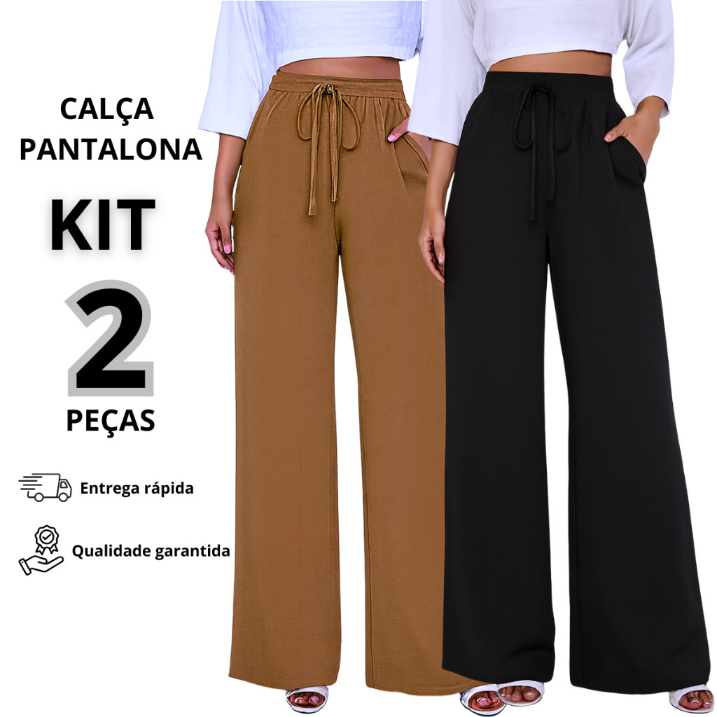 Kit 2 Calças Pantalona Feminina Tecido Duna com Bolso Cintura Alta com Elástico