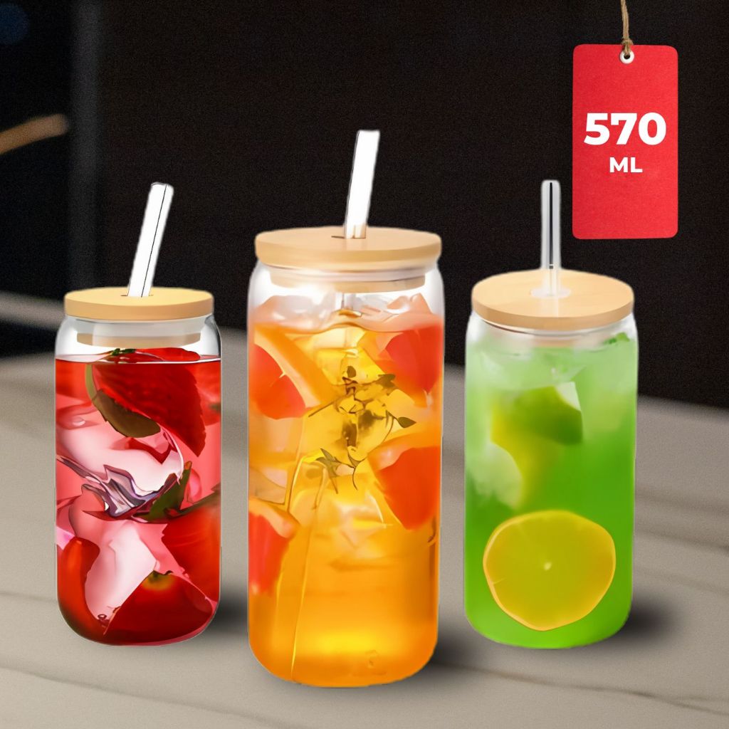 Copo de Vidro com Tampa de Bambu e Canudo de Vidro 370 ML Drinks