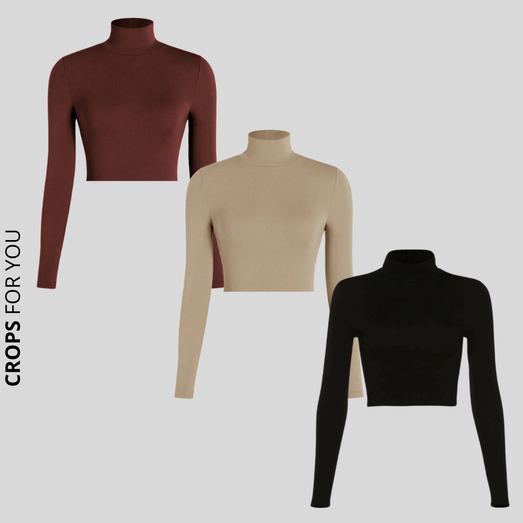 Kit 3 Croppeds Canelados Gola Alta Manga Longa Feminina Moda Gringa Elegante Mulher