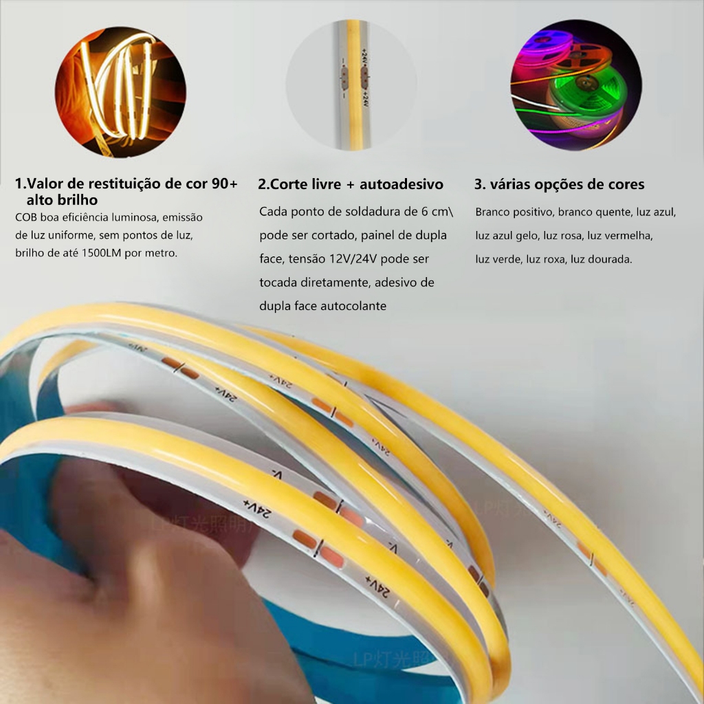 Fita de Led 512 Leds Slim Pix 12W/M Cob IP20 12V 4000K Luz Neutra 3000K Luz Quente 5 Metros