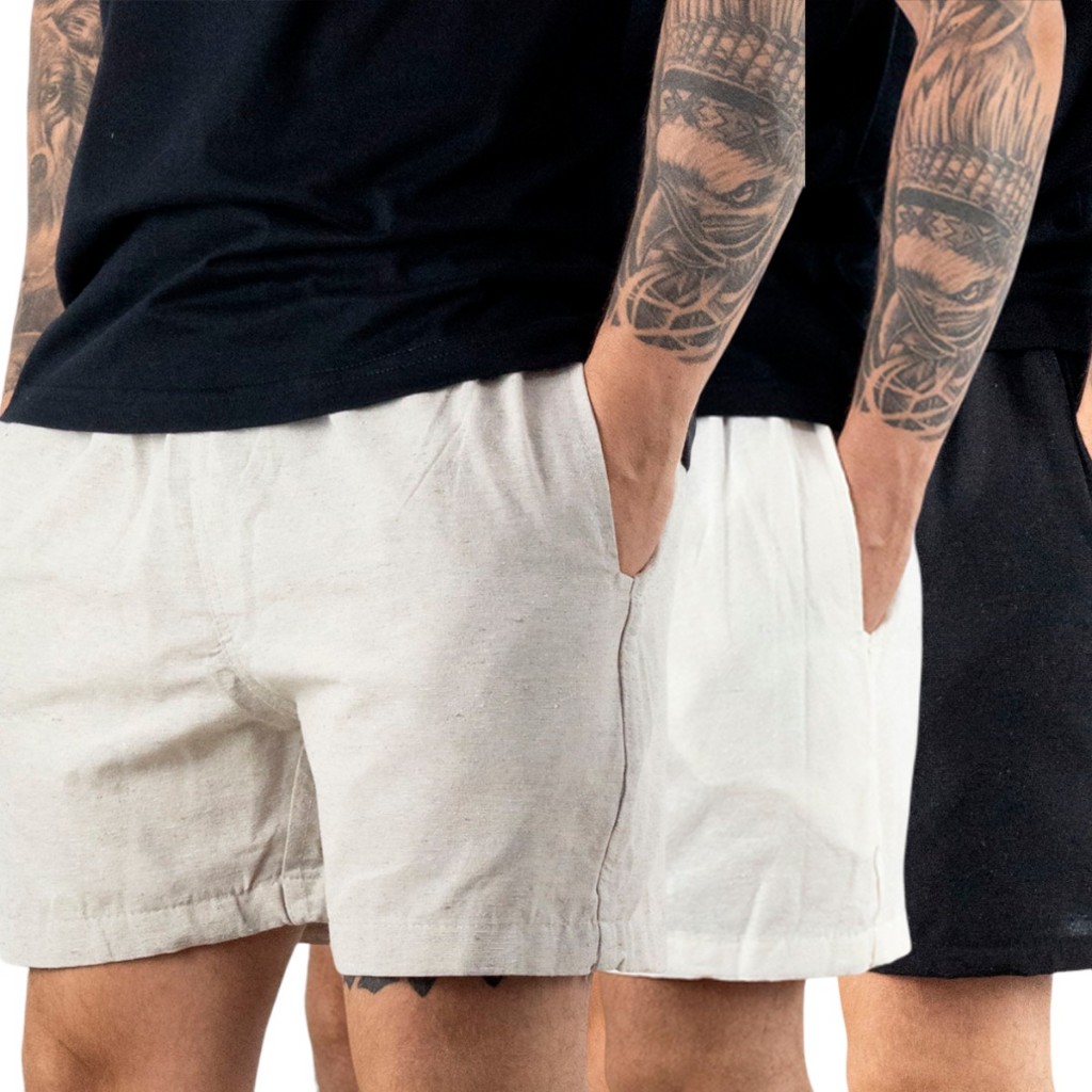 Kit 2 Shorts em Linho Masculino Premium Mauricinho Casual Praia Verão Cor Offwhite Natural e Preto