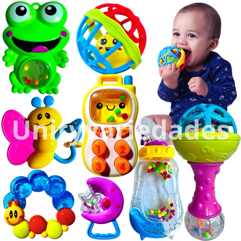 Kit Brinquedo Bebe Chocalho Mordedor Silicone Macio Bola Colorida 8 Peças Presente Para Menina e Menino Móbile para Berço Giratório Pendurar Tapete Térmico Carrinho de Bebê Chocalhos Buba Musical de Mão Avent 0 8 meses 1 ano Rosa Azul Educativos Plástico