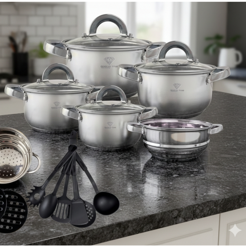 Jogo de Panelas 19 Peças Aço Inox + Acessórios com Fundo 9 Camadas para Indução ou Gás