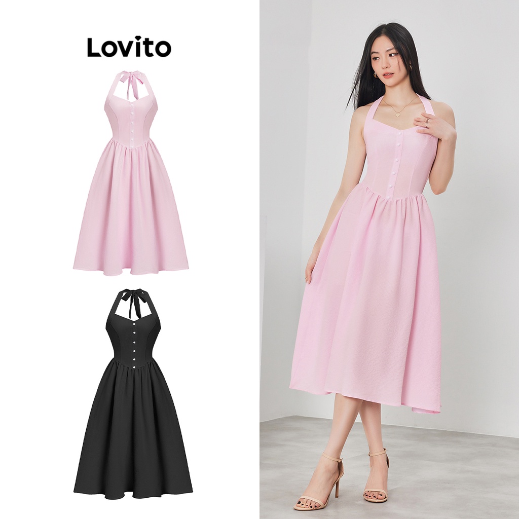 Lovito Vestido Casual Feminino Com Botão Frontal E Laço Liso LBE04130 (Preto)