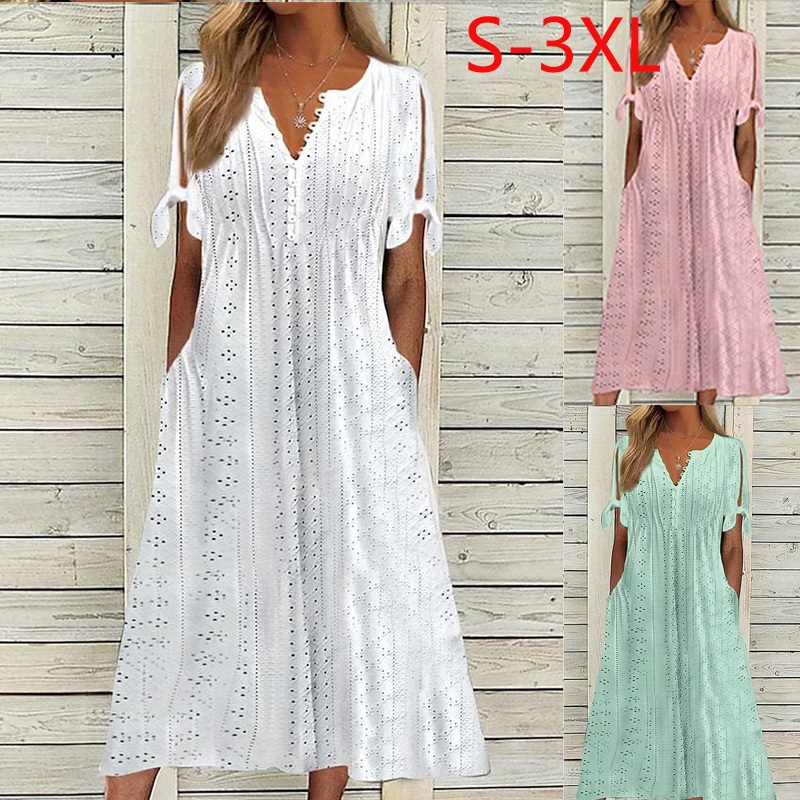 Vestido De Verão Mulher Cor Sólida Manga Oca Fora Curta V Botões De Pescoço Namoro Bolsos De Renda Linha A Lady Midi Feminino