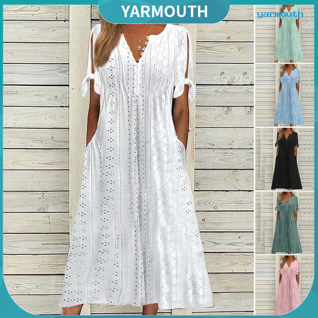 YYR-- Vestido De Verão Mulher Cor Sólida Manga Oca Fora Curta V Botões De Pescoço Namoro Bolsos De Renda Linha A Lady Midi Feminino
