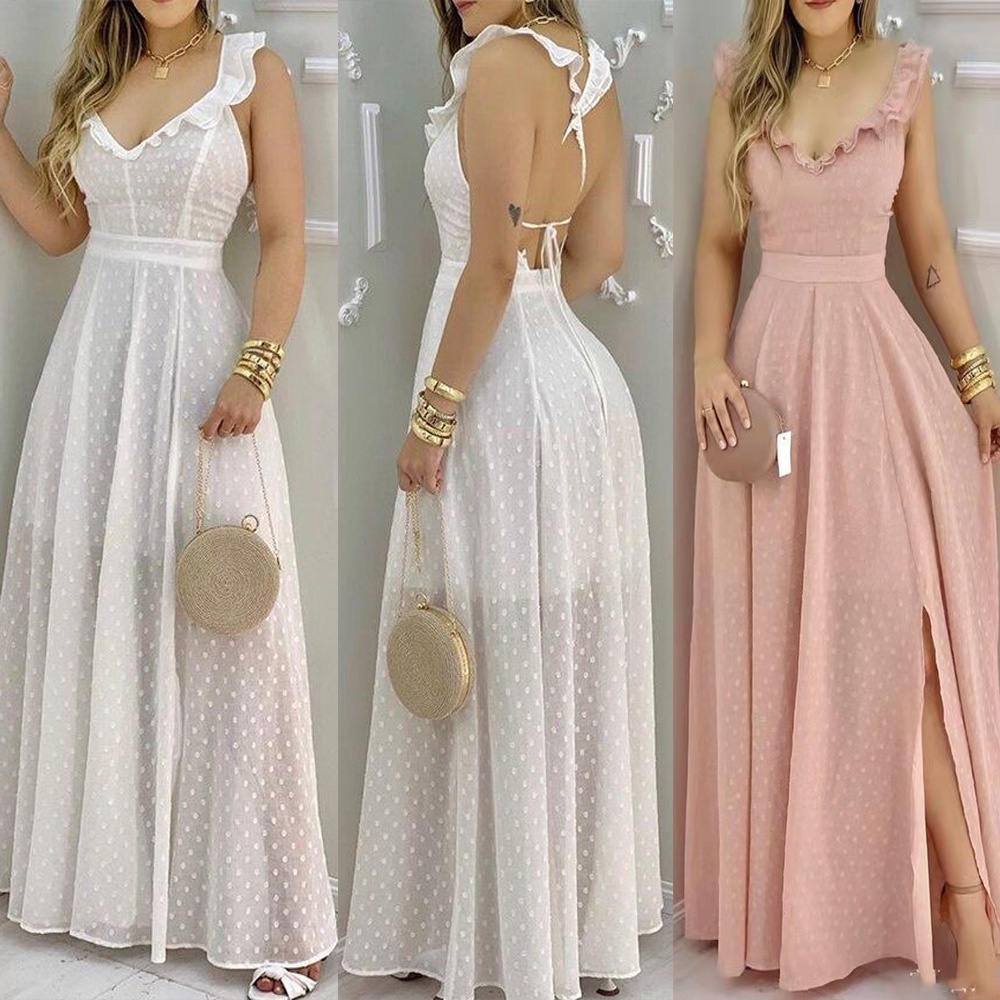 Vestido Longo Feminino Bandagem Sem Mangas Gola V Desmanchado Branco Rosa Liso Cor Polca Ponto Com Fenda