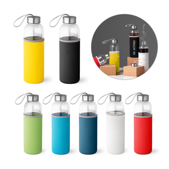 Garrafa de Vidro Squeeze Com Capinha Em Neoprene 500Ml Varias Cores Lindas Escritorio Escola Moderna
