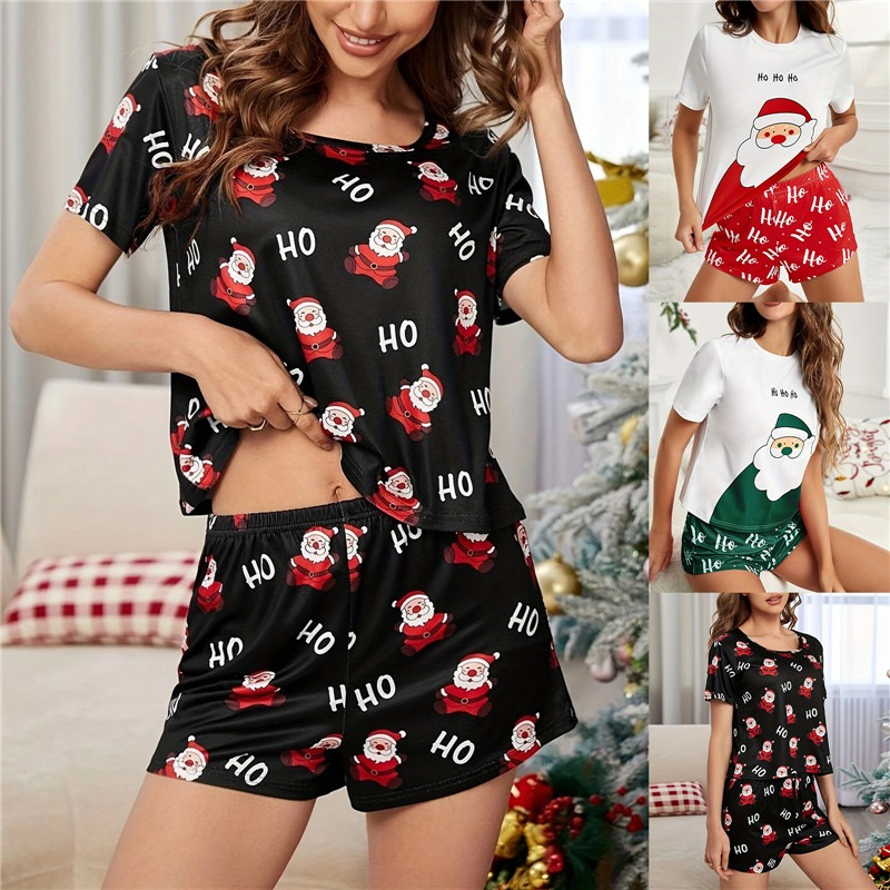 Conjunto De Pijama Feminino Adulto Natal De Seda / Manga Estilo curto / Flexível / Confortável / Duas Peças 2024