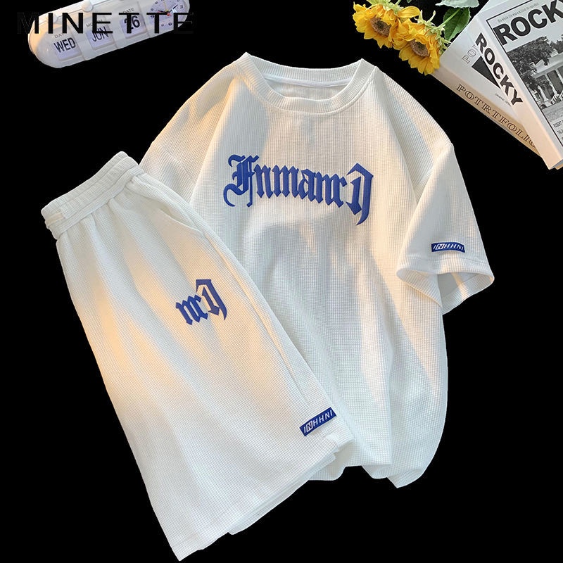 Casal Coreano De Waffle Fato Casual Feminino De Manga Curta Solto Conjunto De Duas Peças Simples De Verão