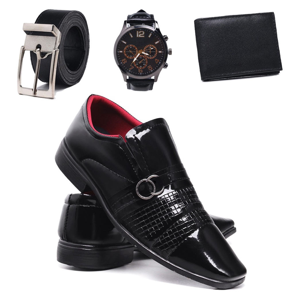 Kit Sapato Social Masculino em Verniz Homem Elegante Com Relogio + Cinto + Carteira