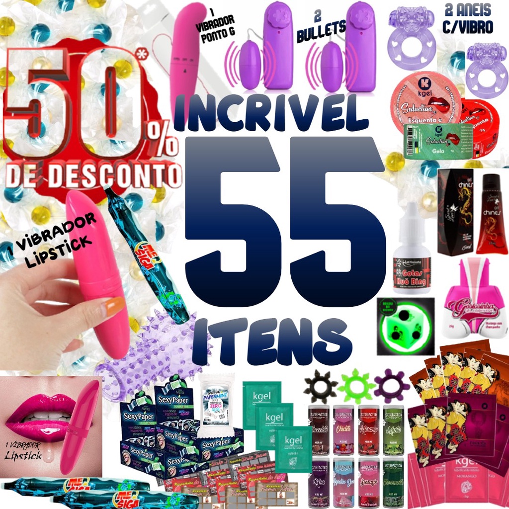 Kit Erotico 55 Itens Sex Shop com Vibrador ponto G + vibrador batom lipstick + vibradores bullet + aneis com vibro + gel beijavel + dedeira massageadora