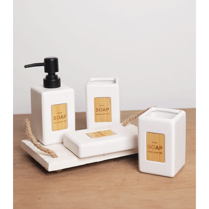 Elegante conjunto de banheiro de cerâmica nórdica com detalhes em bambu - conjunto de 4 peças