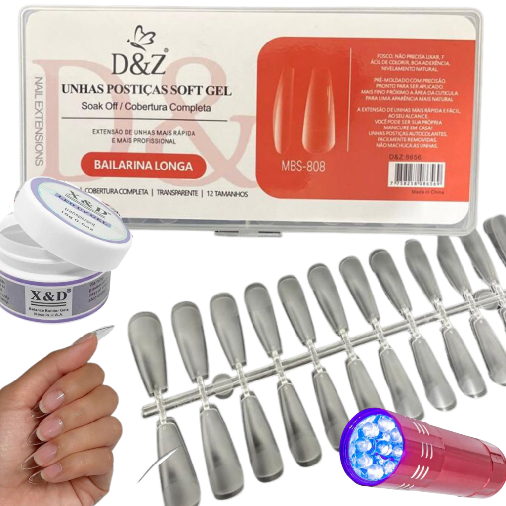 Kit Alongamento Unhas Unha Postiça Soft Gel Fosca D&Z Tips em Gel - Transparente