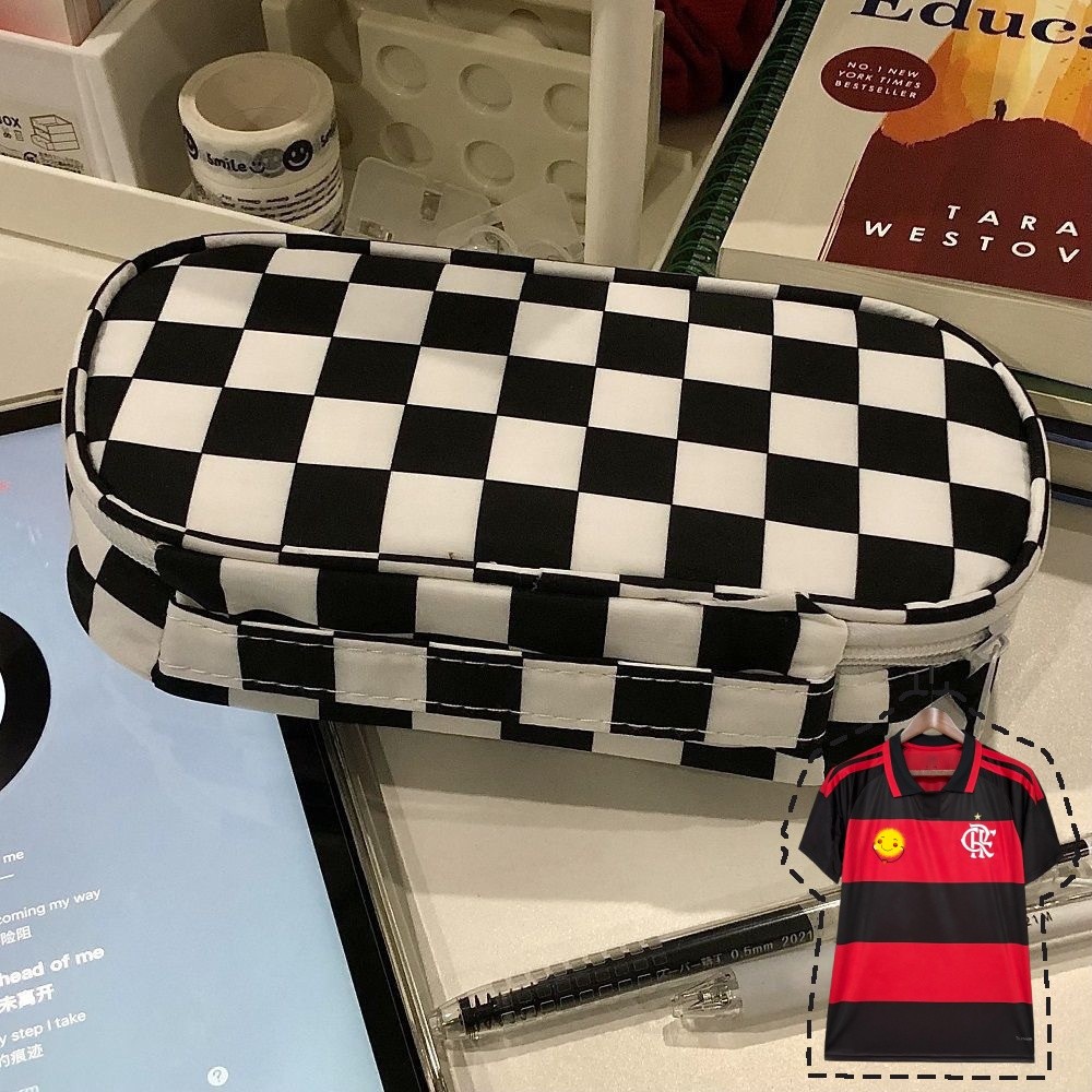 1Pc Estojo de Lápis Xadrez Preto e Branco, Grande Capacidade, Caixa Pequena e Fresca, Bolsa de Armazenamento Criativa e