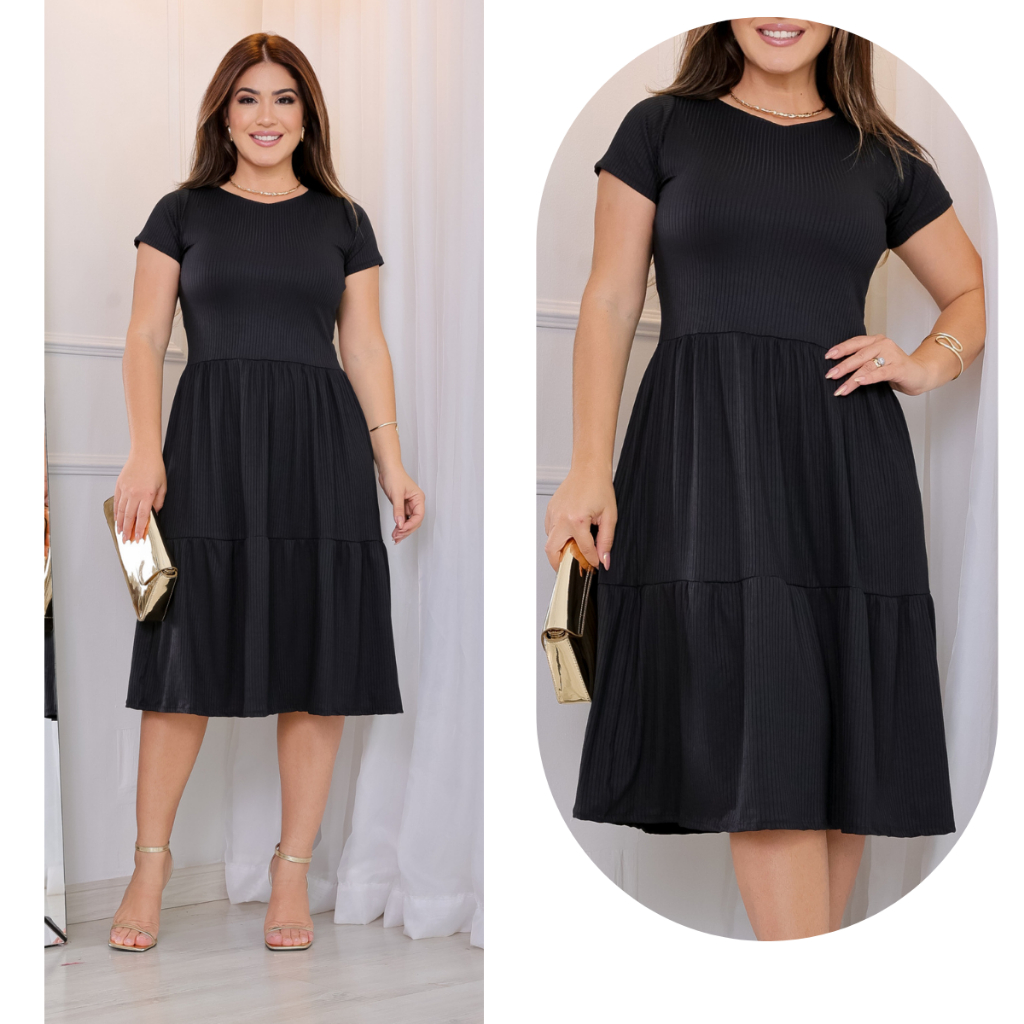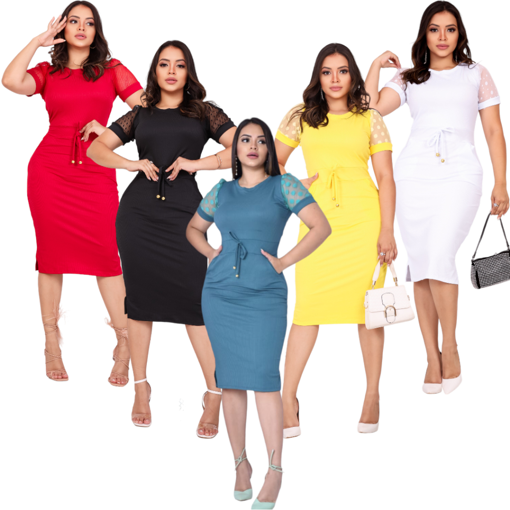 Vestido Feminino Mídi Manga Curta Tendencia Malha Canelada forrada Moda Social Evangélica Plus Size