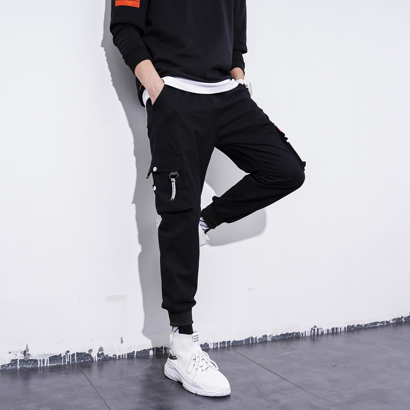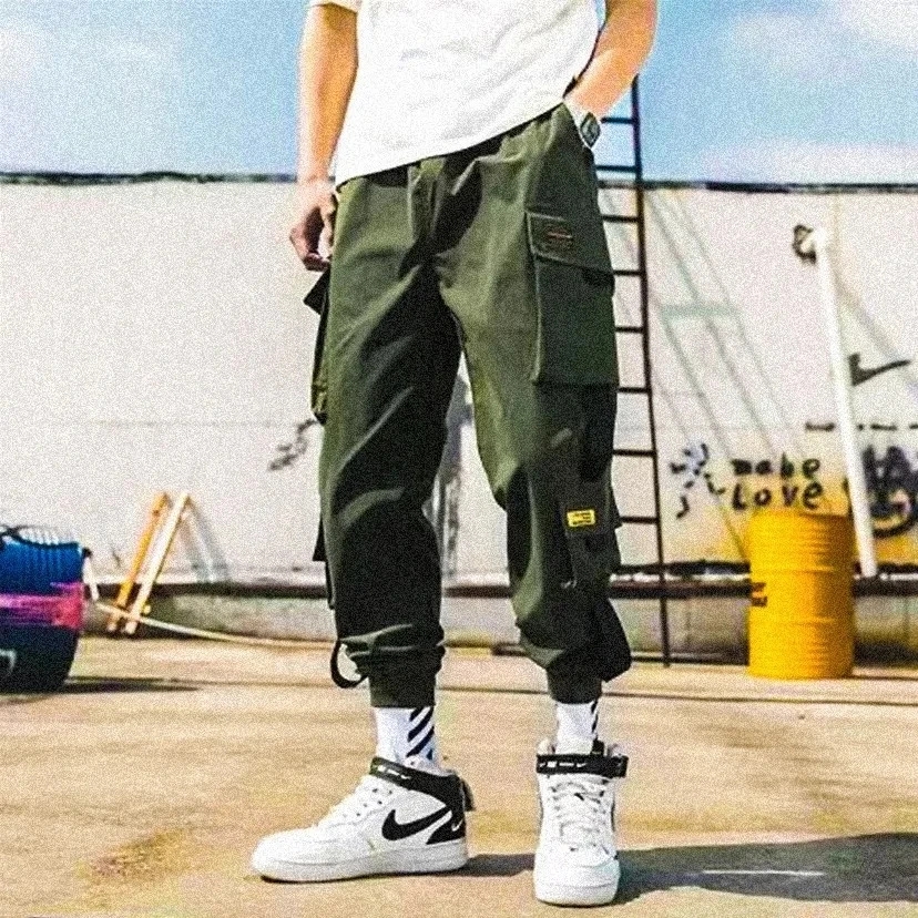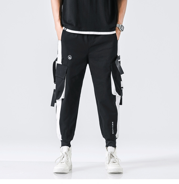 Funcional Fita Preta Ocasional Dos Homens Novos Calças Cargo Preto E Branco Listras Com Bolsos Hip Hop Streetwear Casual Jogger