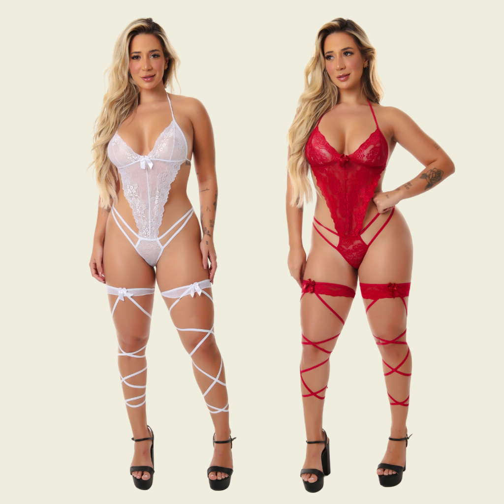 Kit 2 Lingerie Sexy Fio Dental Body Apressadinha Sensual de Renda Conjunto Langerie Gladiadora Cinta Liga Fantasia Erotica