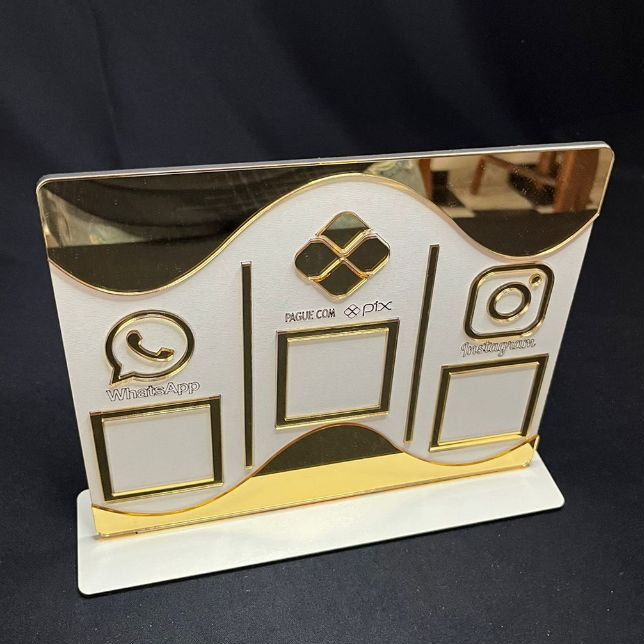 Placa Display de Mesa e Balcão para QR Code WHATSAPP PIX INSTAGRAM no MDF Branco e Acrílico Dourado Espelhado