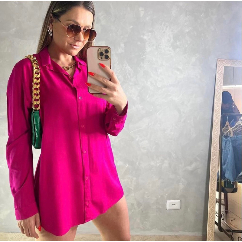 Vestido Feminino Chemise Saída de Praia Manga Longa Com Bolso Frontal Camisao