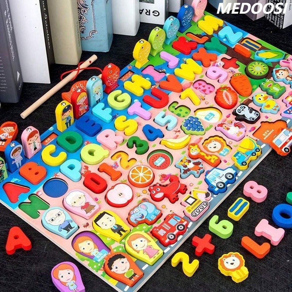 MEDOOSI-Quebra-cabeça com números de madeira Classificador de formas Jogo de contagem e correspondência Jogo de pesca magnética Placa logarítmica Brinquedo Montessori para crianças