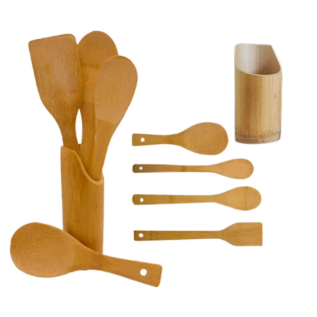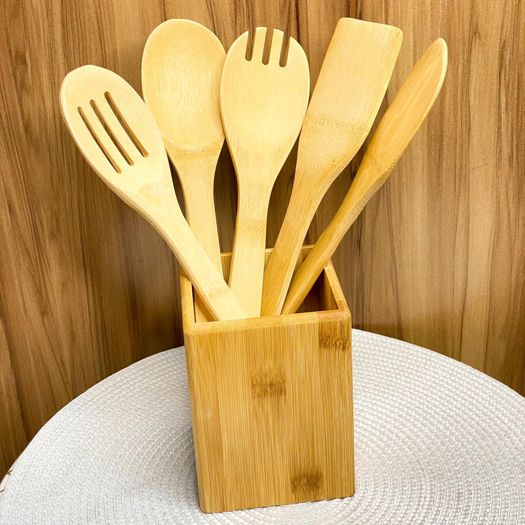 Kit Colher De Pau Utensílios Em Bambu 5 (4 talheres + suporte) Peças Anti Fungos Casa Cozinha Colheres