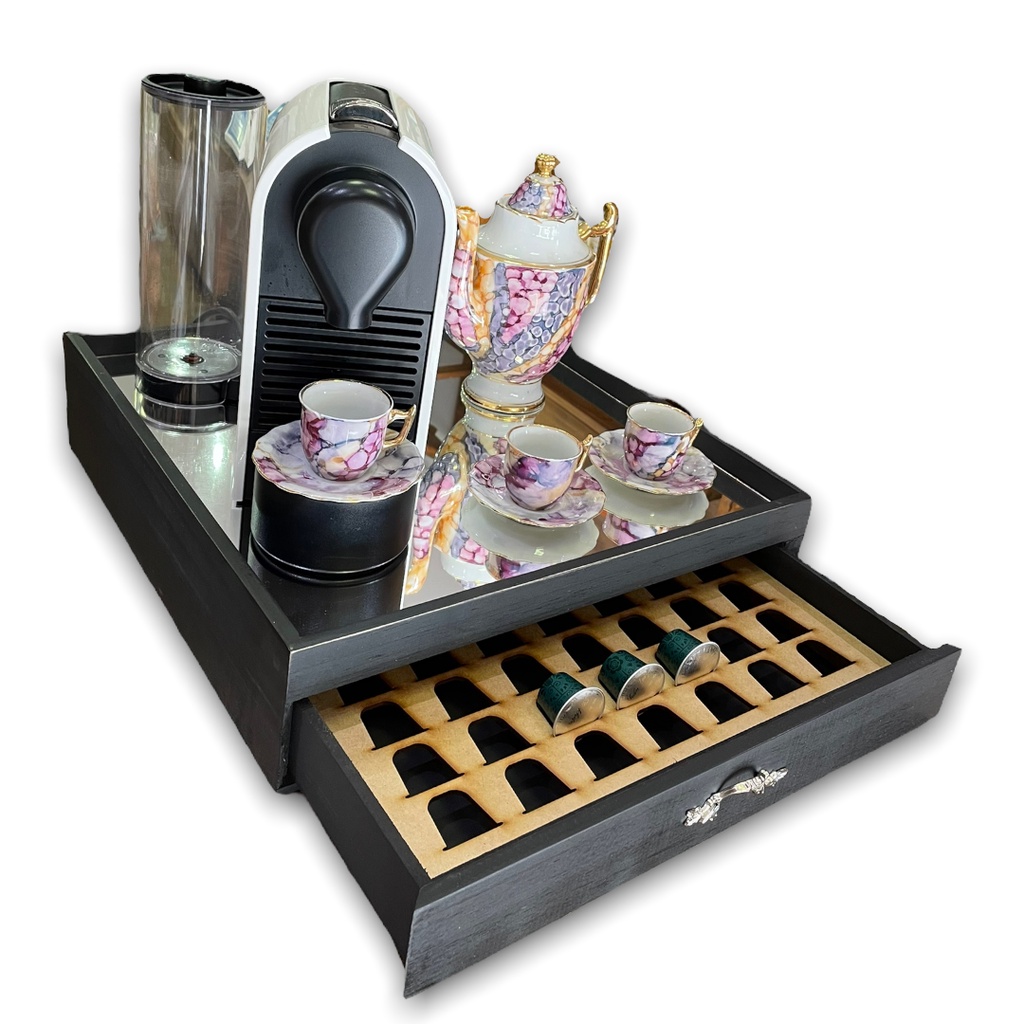 Bandeja Cantinho do Cafe Preta Lisa Porta 24 Capsulas Com Gaveta Embutida para Apoio de Cafeteria Para Servir Organizar Grande Mdf