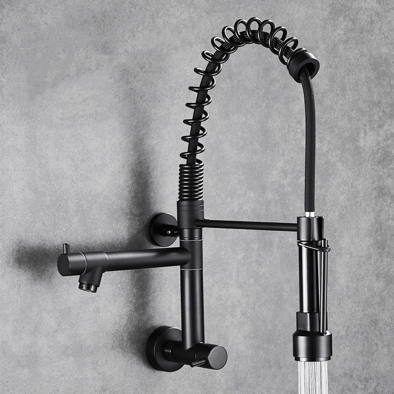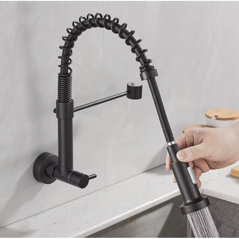 Torneira de cozinha 2 em 1 giratória 360°, de aço inoxidável 304 preto montada na parede