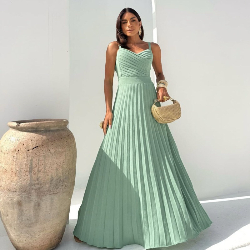 Vestido Longo Plissado Femenino de Alça Elegante Verão Duna Tendência Resort/ Festa/ Slim