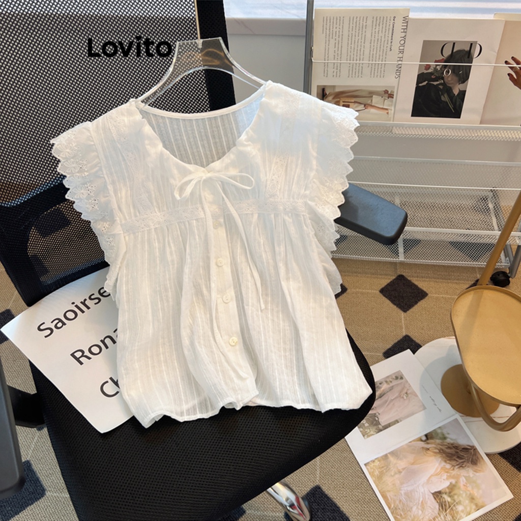 Lovito Blusa Feminina Casual De Renda Lisa Com Bordado De Ilhó E Botão Frontal L77ED023