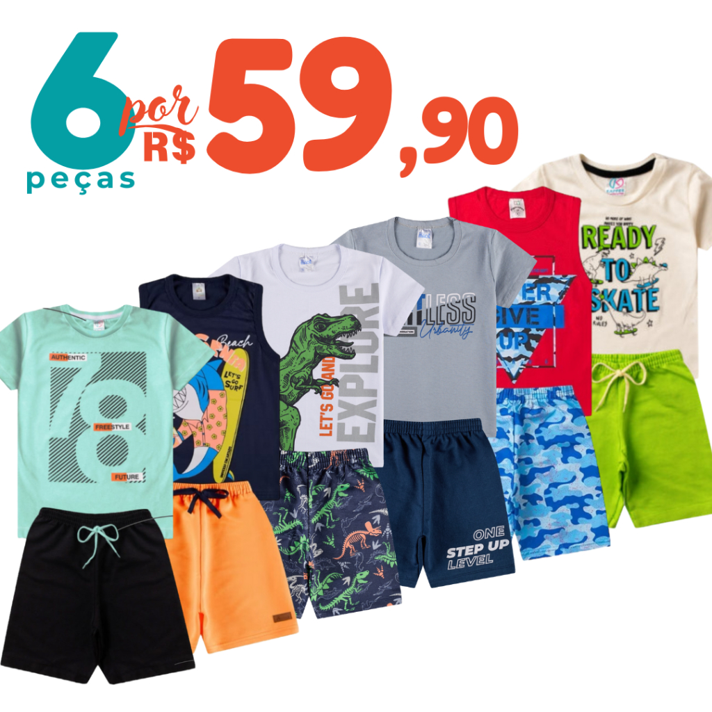 Kit Sortido 6 Peças de Roupas Infantil Menino 3 Camisetas + 3 Bermudas - Promoção - Kit com 3 Conjuntos de Roupa Infantil Menino Verão Menino Bebe Barato
