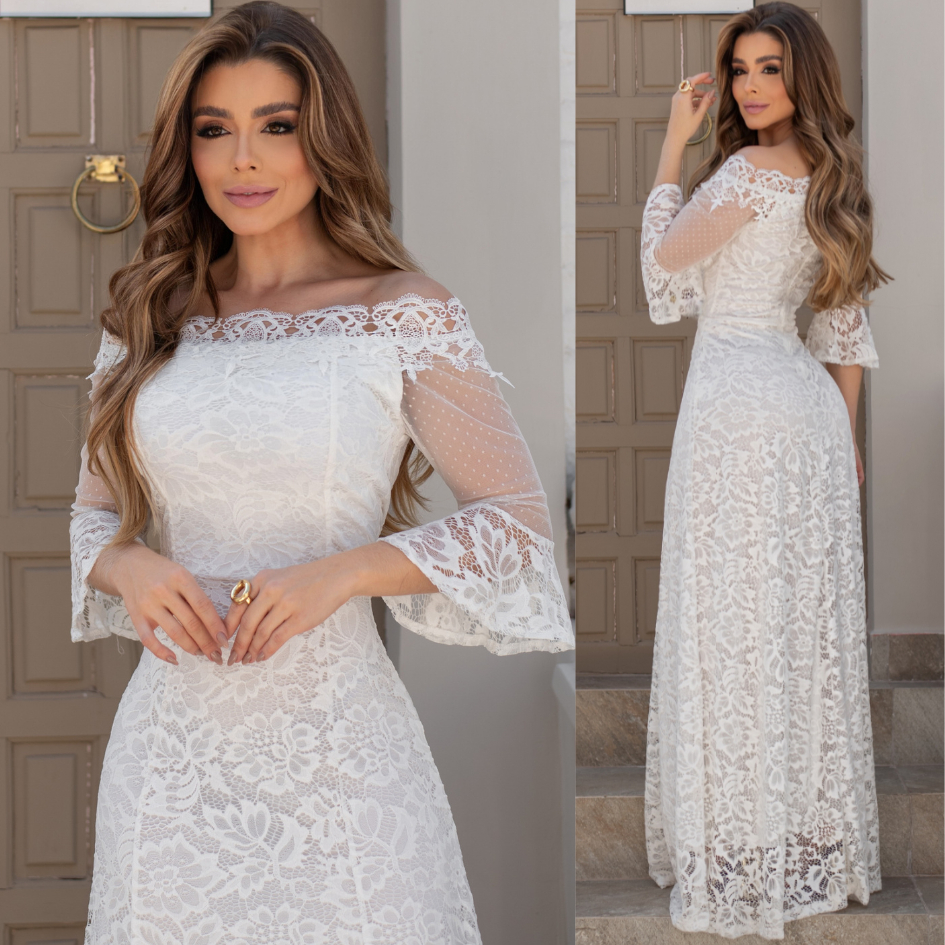 Vestido De Noiva Casamento Civil e Religioso Ombro a Ombro Manga com Babado Renda