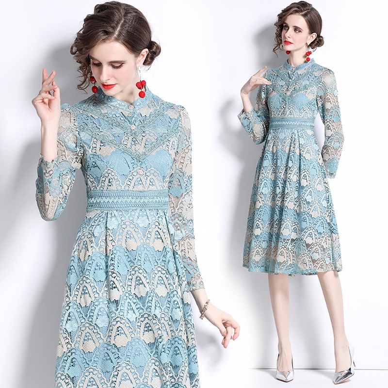 Vestido Feminino De Manga Longa Com Renda De Cintura Alta Bordada Em Linha A