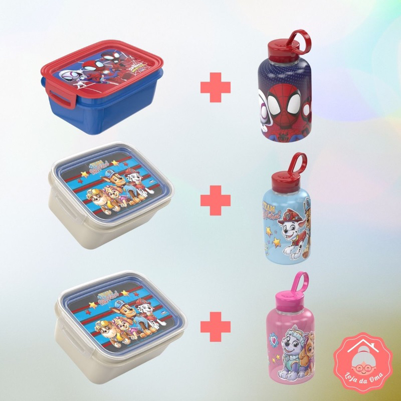 Kit Lancheira Patrulha Canina e homem aranha - Marmita hermética com divisória e Garrafinha de rosca Plasútil / Marmitinha / Garrafa de suco / Escolar