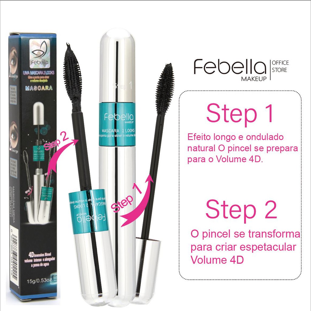 Máscara de cílios 2 em 1 Febella, volume, definição, alongamento, à prova d'água, 4D efeito marcante