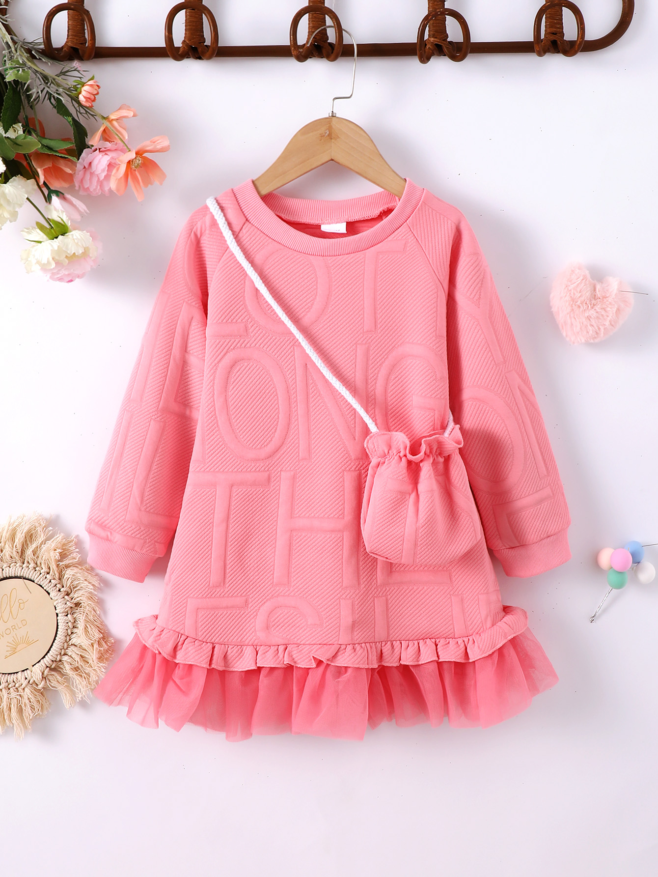Vestido De Menina Para 2-8 Anos De Manga Longa Cor Sólida Princesa Com Bolsa Crossbody 2PCS Roupa Casual Toddler
