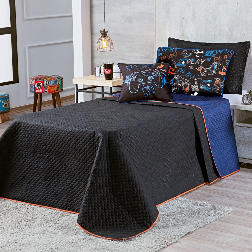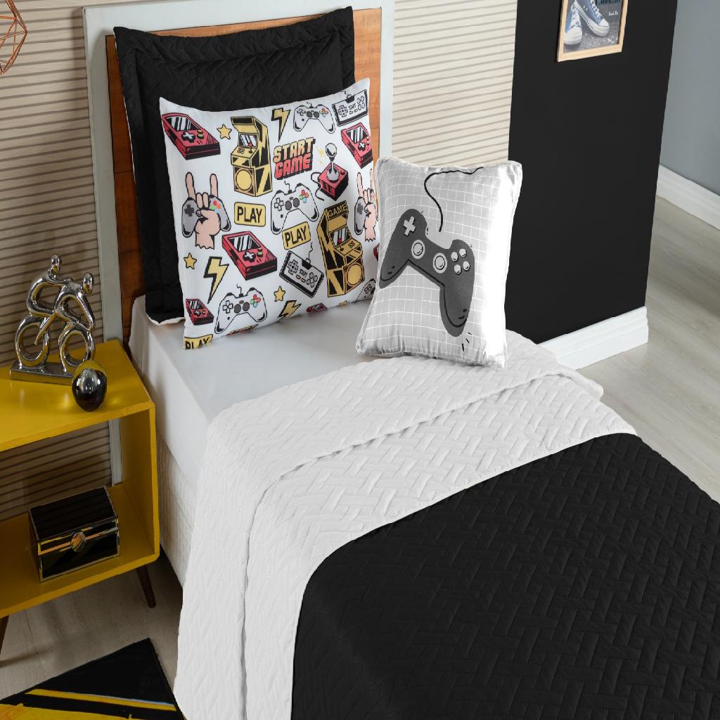 Kit Colcha Cobre Leito Solteiro 5 Pçs Matelado Video Game Preto