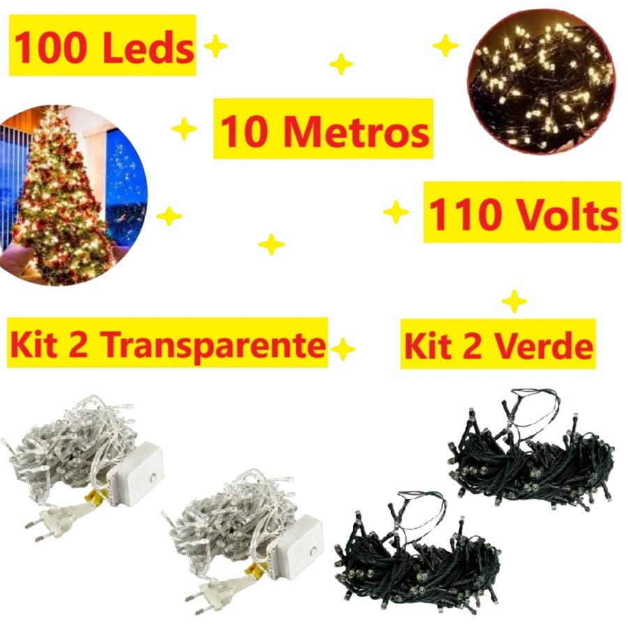Kit 2 Caixa 100 Leds Pisca 10M 110V Natalino Fio Verde Ou Transparente Decorativo Multicolorido
