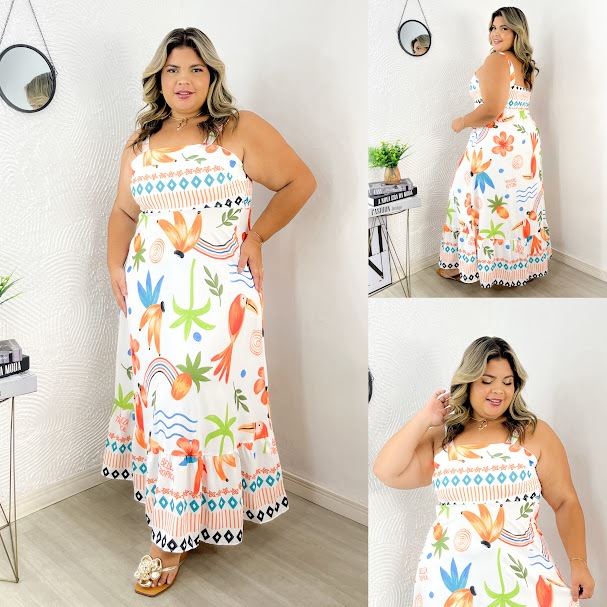 Vestido Longo Amarração nas Costas Alça Plus Size Estampa Tropical Inspiração