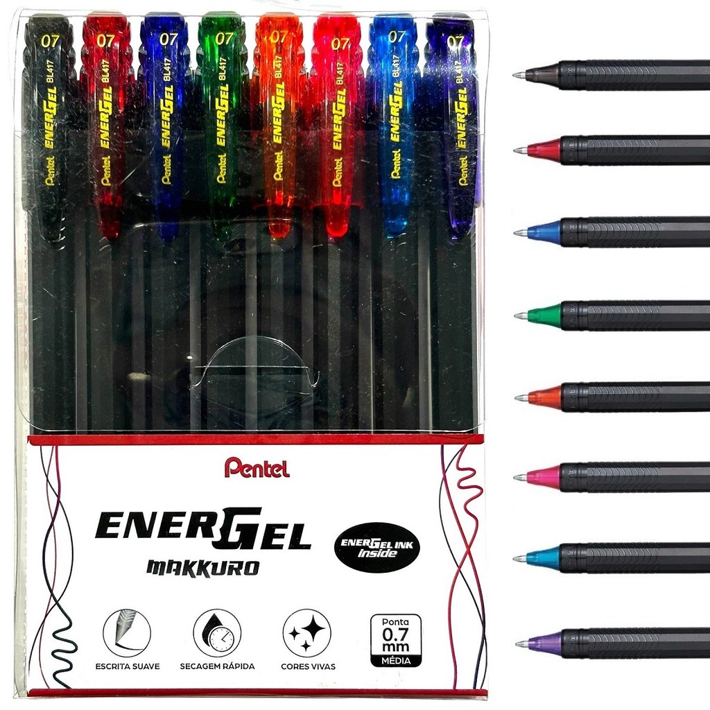 Kit Estojo 8 Canetas Gel Pentel Energel Makkuro 0.7mm - Ponta Media
