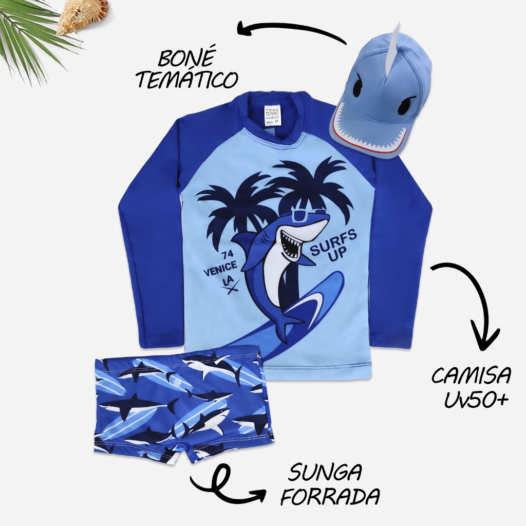 Kit Praia Sunga Infantil + Camisa Proteção Solar Uv + Boné