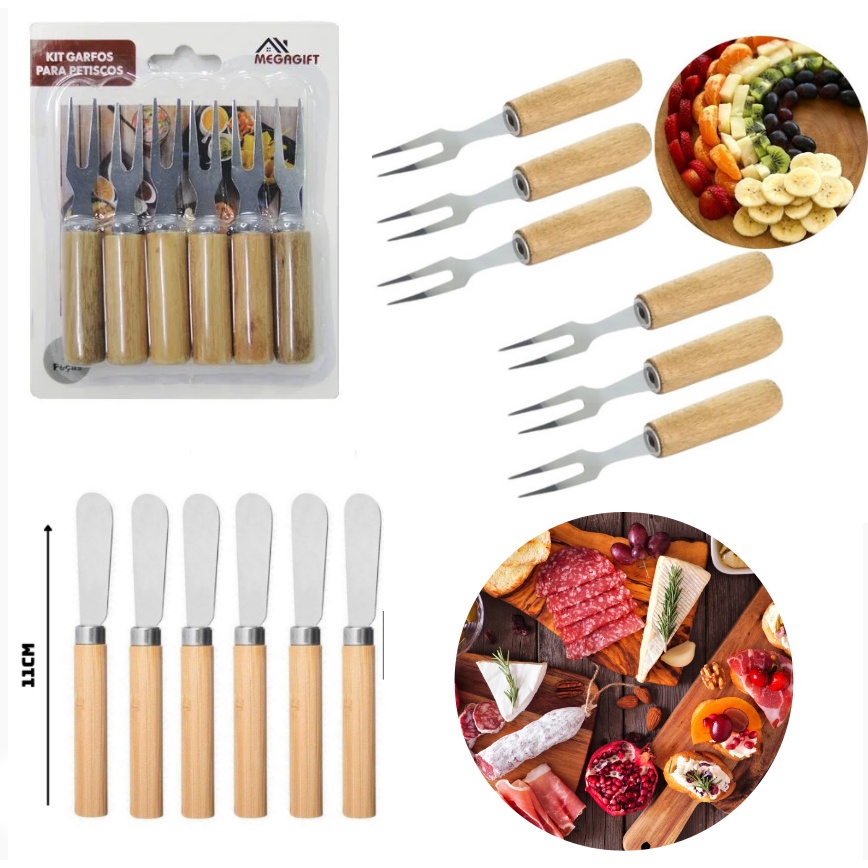 kit com 6 Garfo garfinho espatula para petiscos, frutas e aperitivos inox cabo de madeira frios queijos pate
