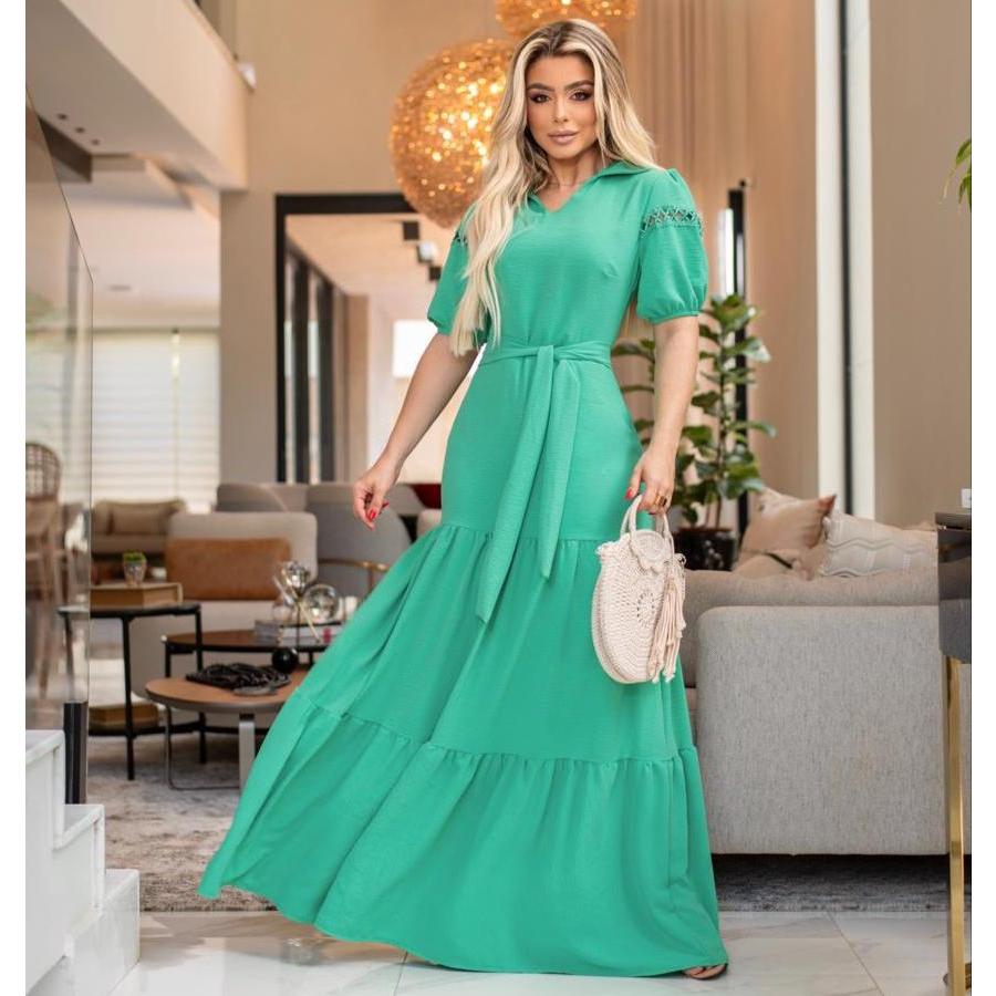 Vestido longo no tecido dunas todo forrado na helanca manga curta com lindo detalhe em guipir e elasteque detalhe de gola polo saia 2 maria acompanha faixa do mesmo tecido moda evangélica