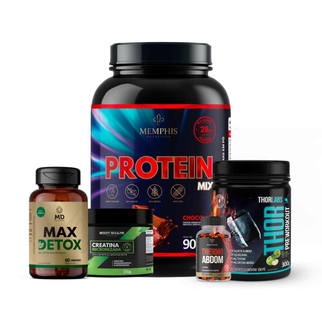 Kit Whey Protein 900g Pote + Pré Treino + Creatina 150g + Thermo Abdom + Coqueteleira Body Shape