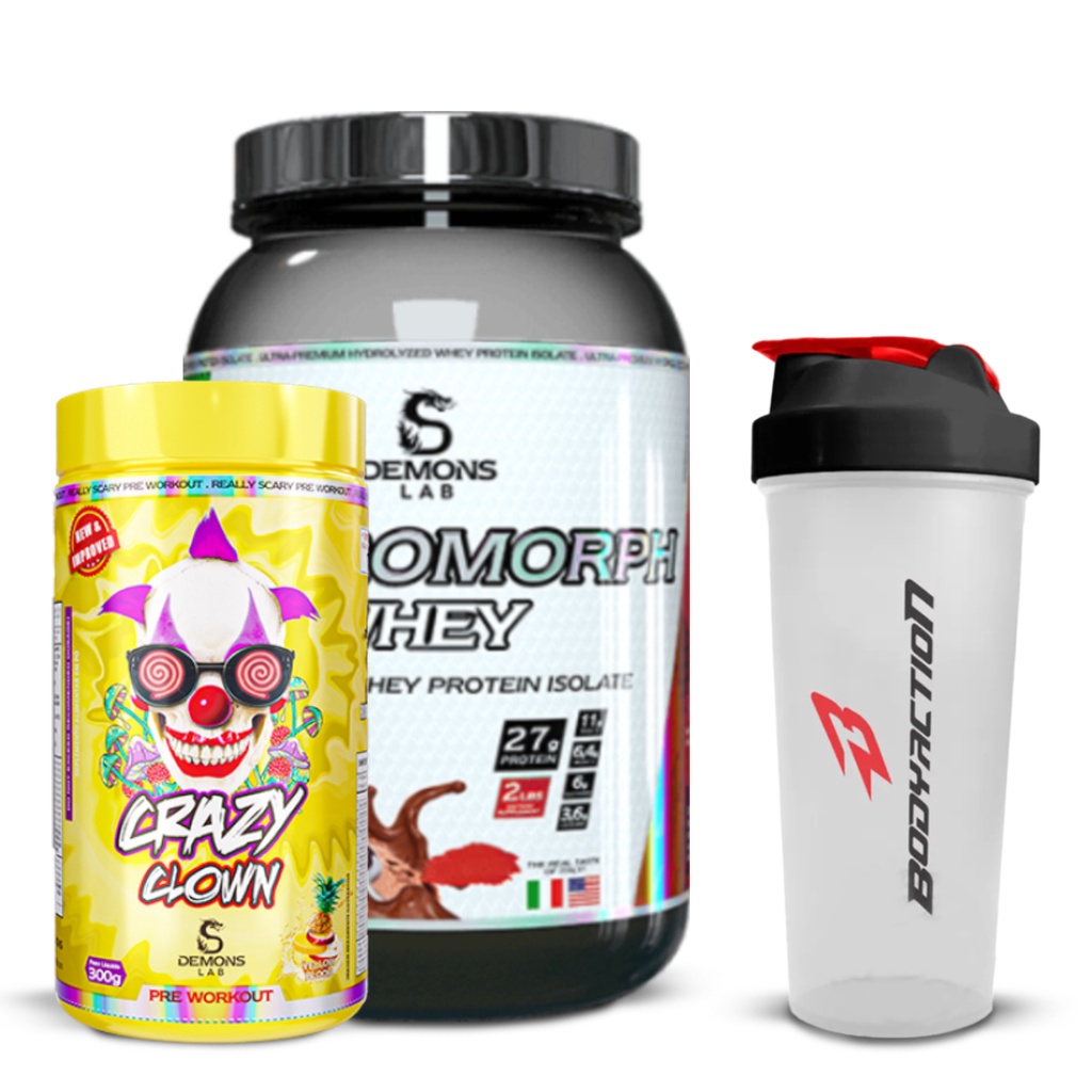 Kit Hydromorph 900g Whey Protein Demons Lab + Pré-Treino Crazy Clown + Coqueteleira