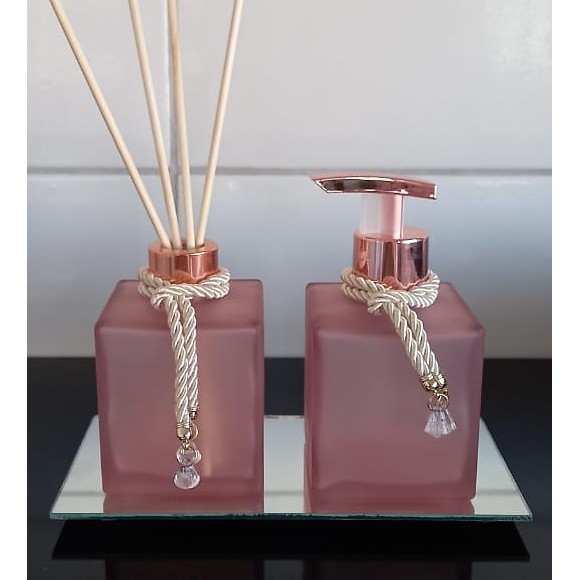 Kit Lavabo Cubo Rose Prime Luxo em Vidro 250ml - Saboneteira + Difusor